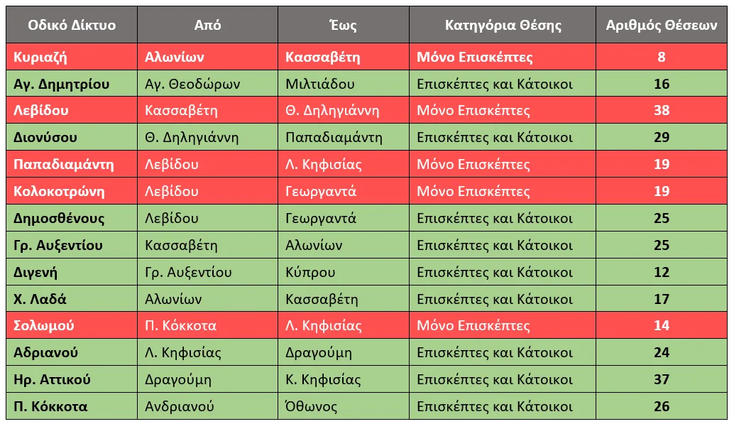 Το νέο σύστημα, που έρχεται να αναβαθμίσει ψηφιακά, το σύστημα ελεγχόμενης στάθμευσης που ίσχυε μέχρι σήμερα, θα λειτουργήσει σε πιλοτικό στάδιο από 8-21 Ιουλίου 2025. Θα εφαρμόζεται στο παρακάτω δίκτυο οδών και περιλαμβάνει 92 θέσεις αποκλειστικά για Επισκέπτες, 211 μικτές θέσεις για Κατοίκους και Επισκέπτες, καθώς και ειδικές θέσεις για οχήματα ΑμεΑ, ηλεκτρικά οχήματα, δίκυκλα και φορτοεκφόρτωση.