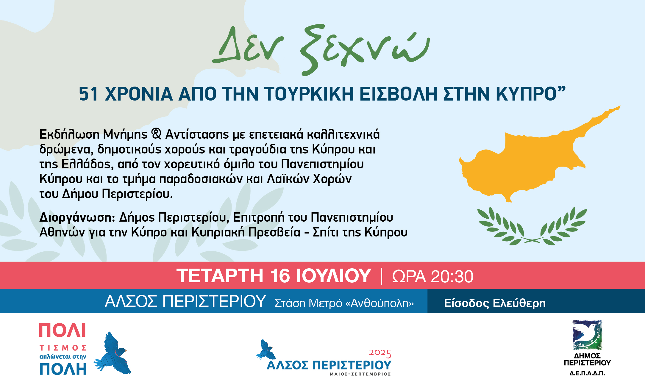 Ο Δήμος Περιστερίου τιμά τα 51 χρόνια από την τουρκική εισβολή στην Κύπρο και προσκαλεί τους πολίτες σε μια ξεχωριστή εκδήλωση Μνήμης και Αντίστασης, την Τετάρτη 16 Ιουλίου 2025 και ώρα 20:30, στο Άλσος Περιστερίου (στάση Μετρό «Ανθούπολη»), με ελεύθερη είσοδο για το κοινό.