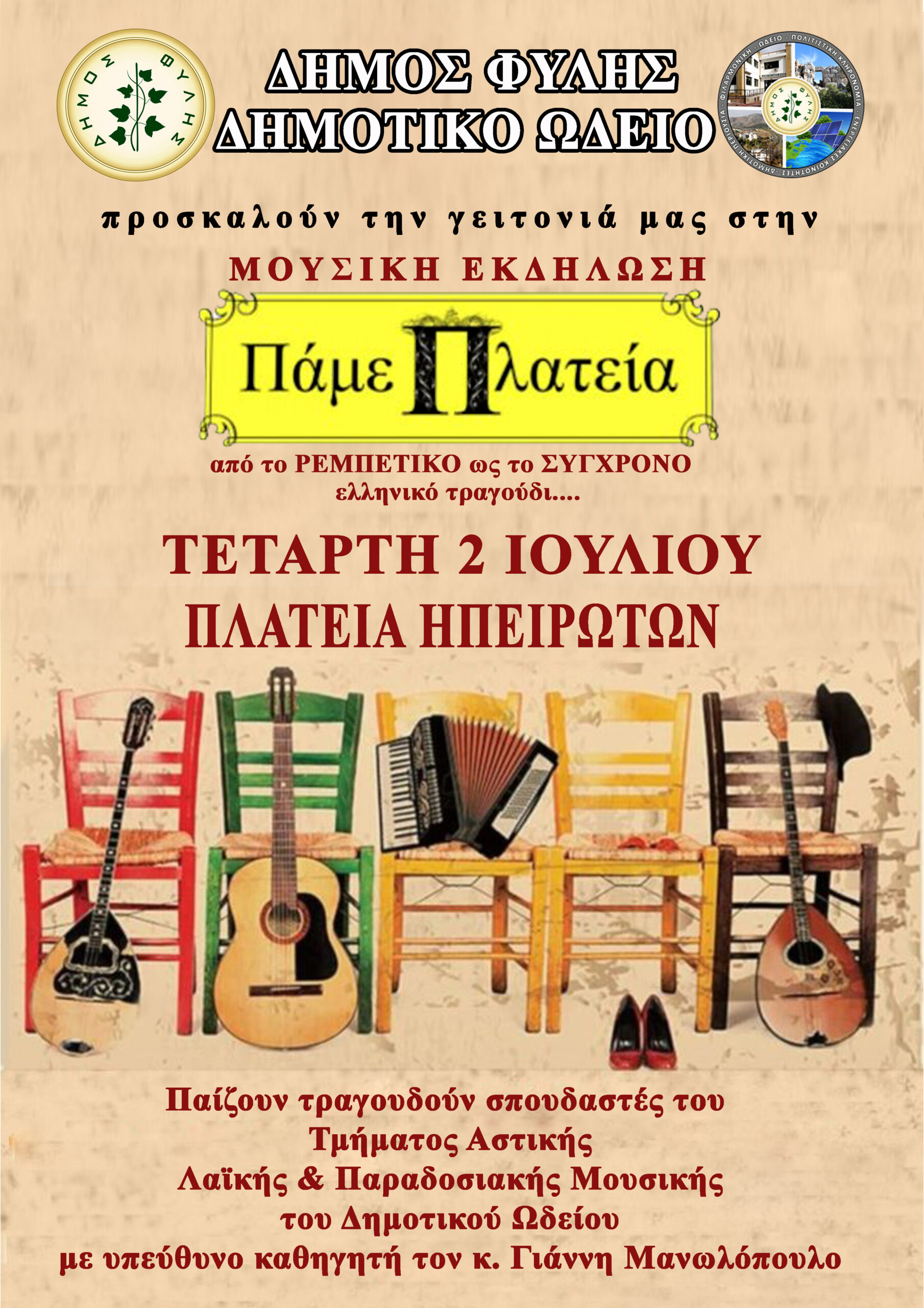 Ο Δήμος Φυλής και το Δημοτικό Ωδείο σας προσκαλούν σε μια σειρά μουσικών εκδηλώσεων στις γειτονιές του Δήμου με τίτλο:«Πάμε Πλατεία!»