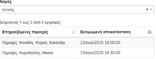 Διακοπή ρεύματος σημειώθηκε σε πολλές περιοχές σε βόρεια και νότια προάστια το μεσημέρι της Τετάρτης (23/7) μεταξύ των οποίων η Κηφισιά, το Ψυχικό, το Χαλανδρί, η Φιλοθέη, η Λυκόβρυση και το Νέο Ηράκλειο, λόγω βλάβης στο σύστημα ηλεκτροδότησης, ενώ διακοπές σημειώθηκαν στη Νίκαια, στον Κορυδαλλό και στον Ωρωπό.