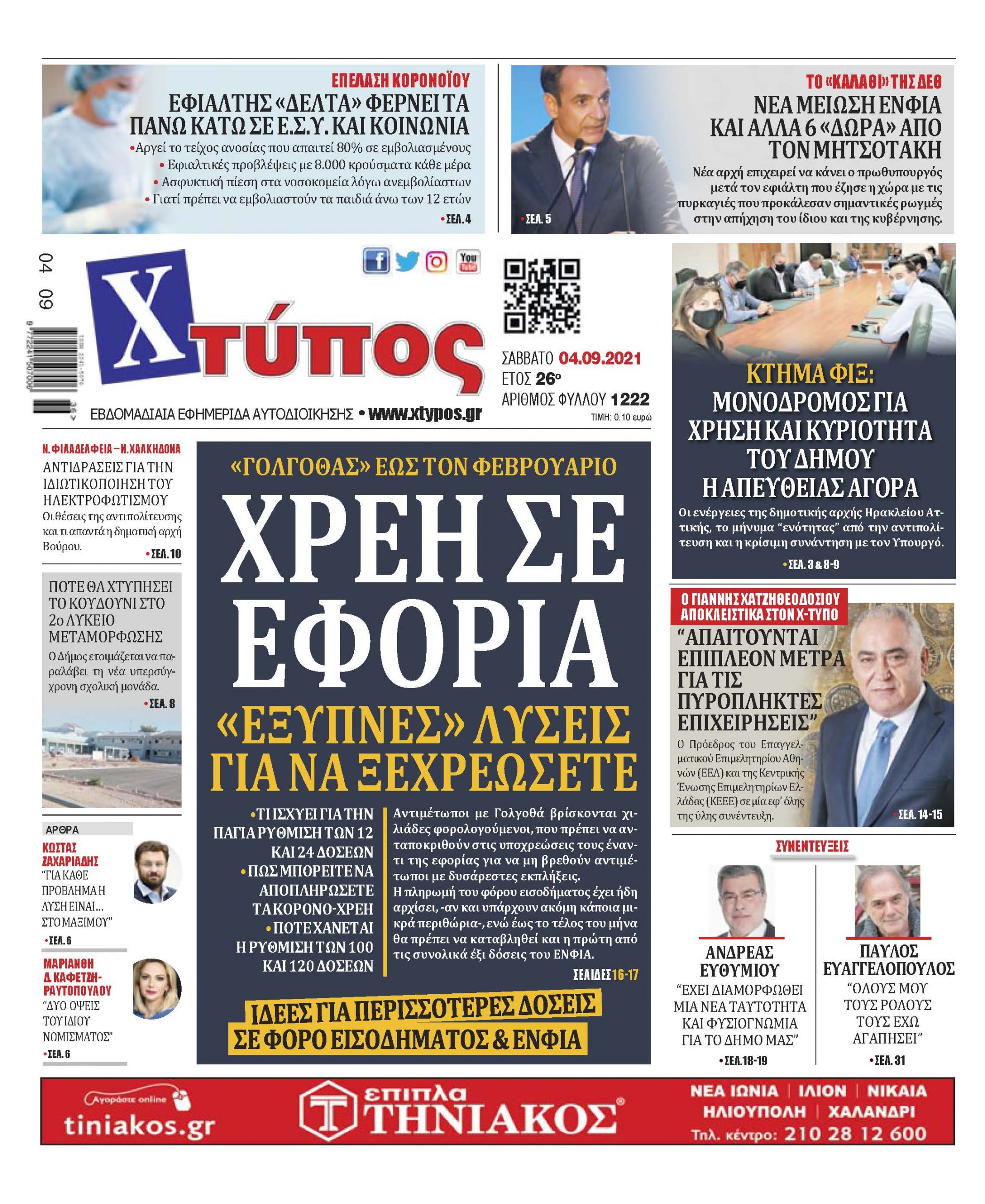 Πρωτοσέλιδο εφημερίδας «ΧΤΥΠΟΣ» Σάββατο 04 Σεπτεμβρίου 2021”