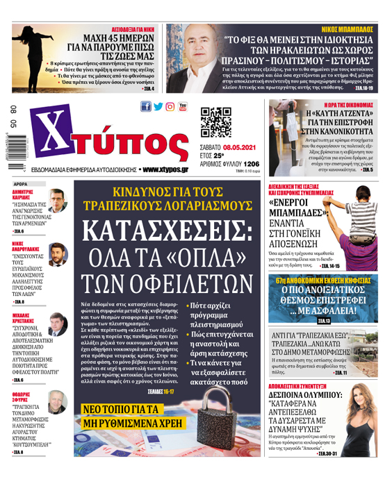 Πρωτοσέλιδο εφημερίδας «ΧΤΥΠΟΣ» Σάββατο 8 Μαΐου 2021”