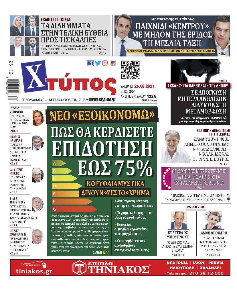 Πρωτοσέλιδο εφημερίδας «ΧΤΥΠΟΣ» Σάββατο 25 Σεπτεμβρίου 2021”