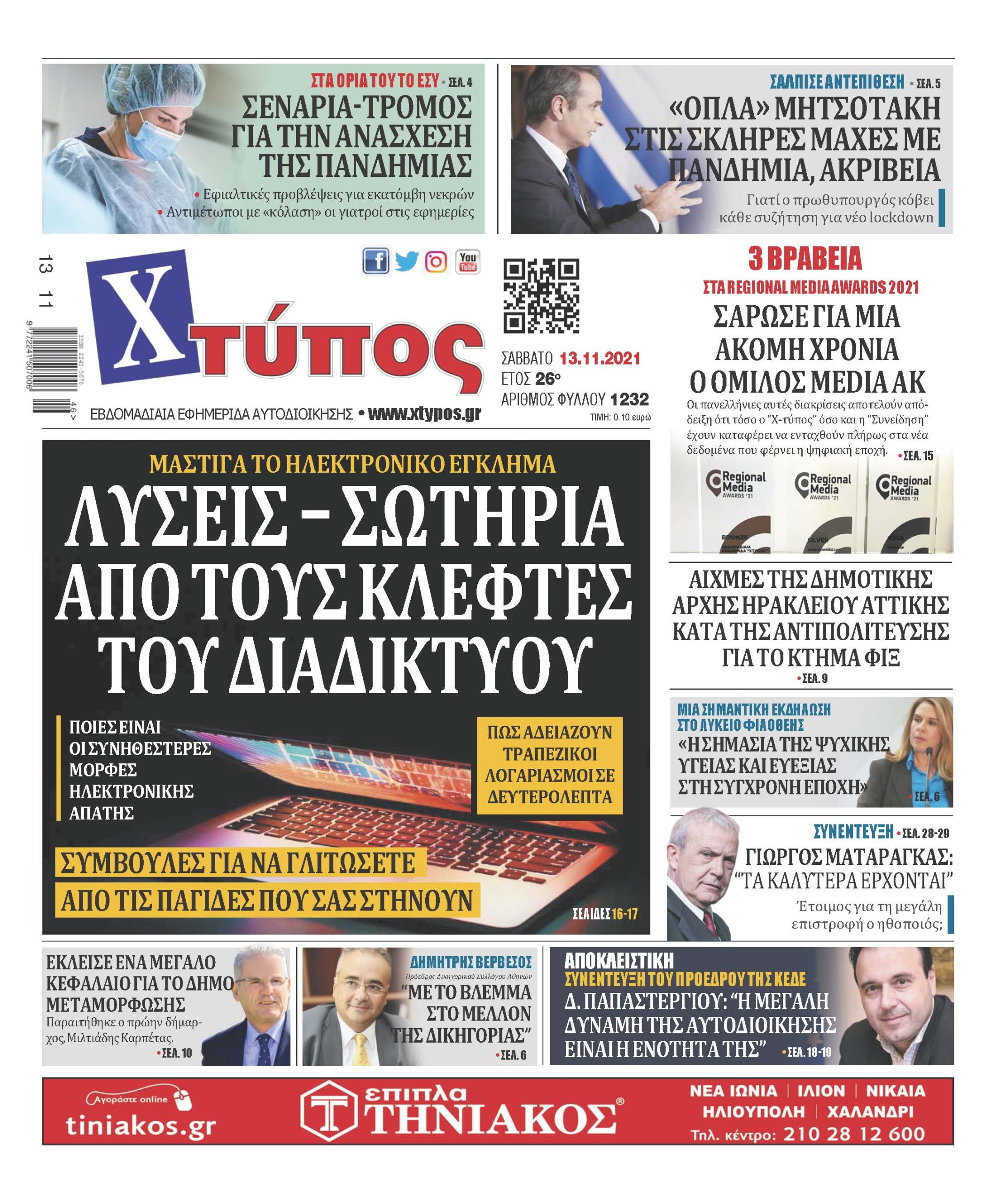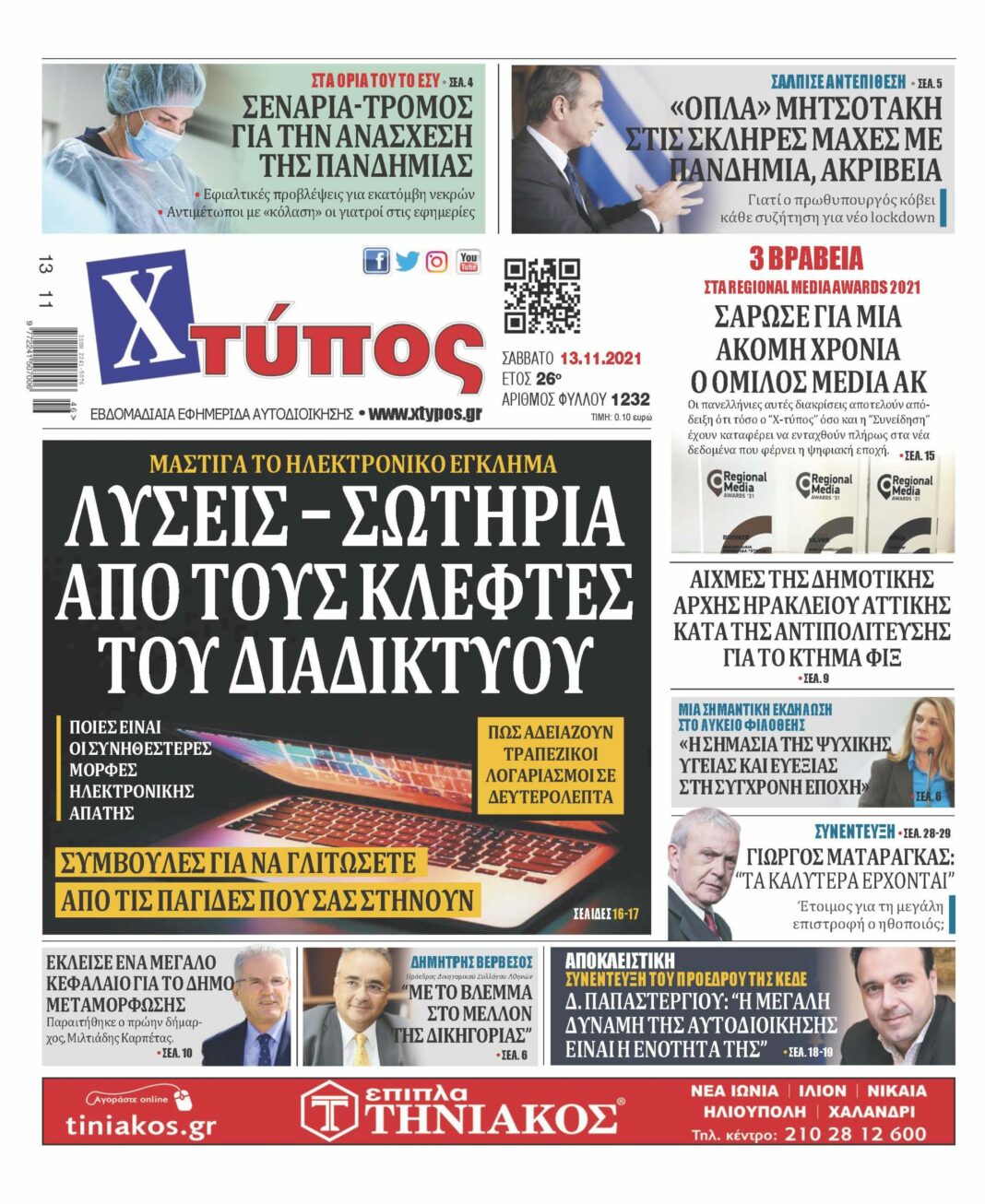 Πρωτοσέλιδο εφημερίδας «ΧΤΥΠΟΣ» Σάββατο 13 Νοεμβρίου 2021”