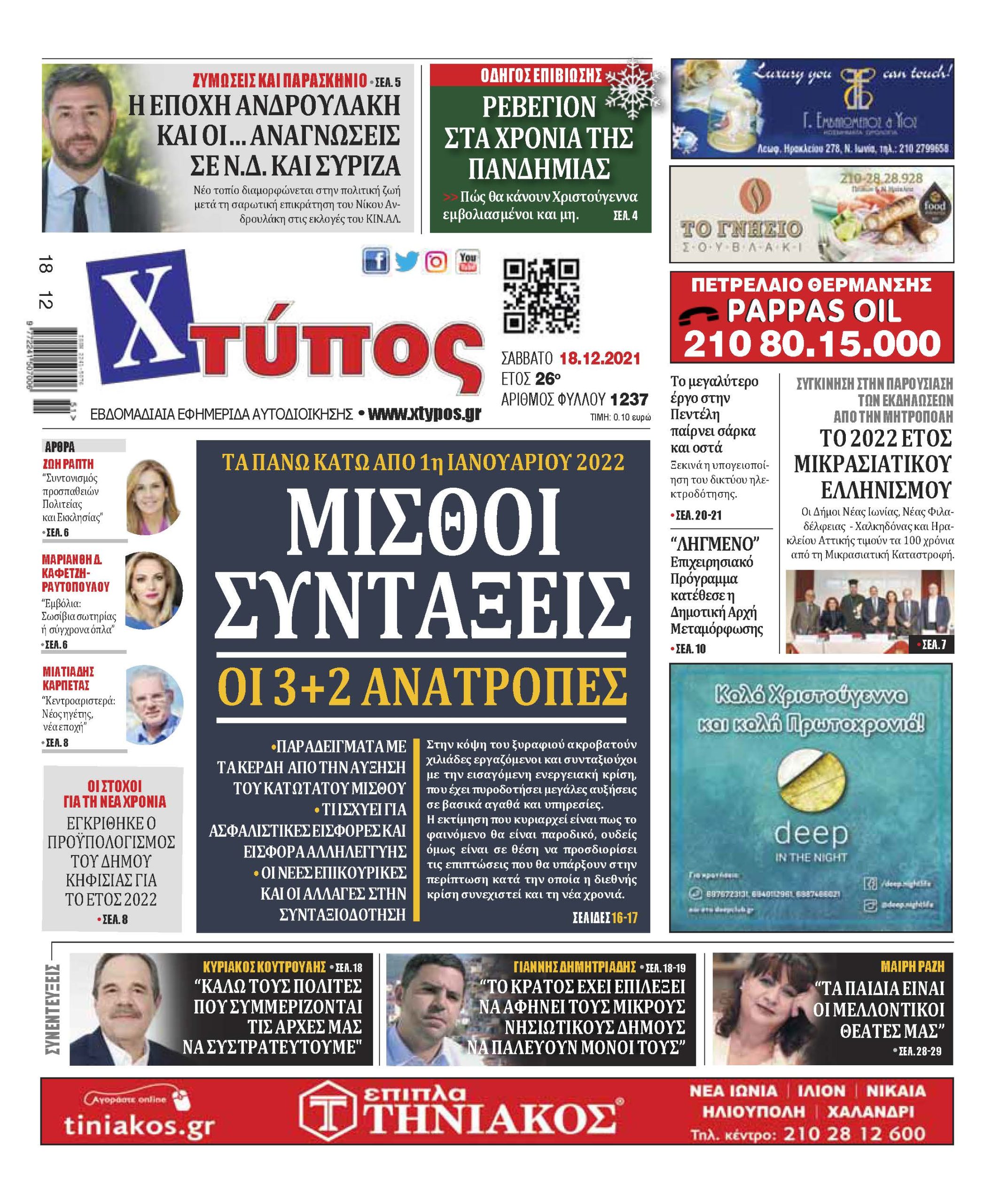 Πρωτοσέλιδο εφημερίδας «ΧΤΥΠΟΣ» Σάββατο 18 Δεκεμβρίου 2021”