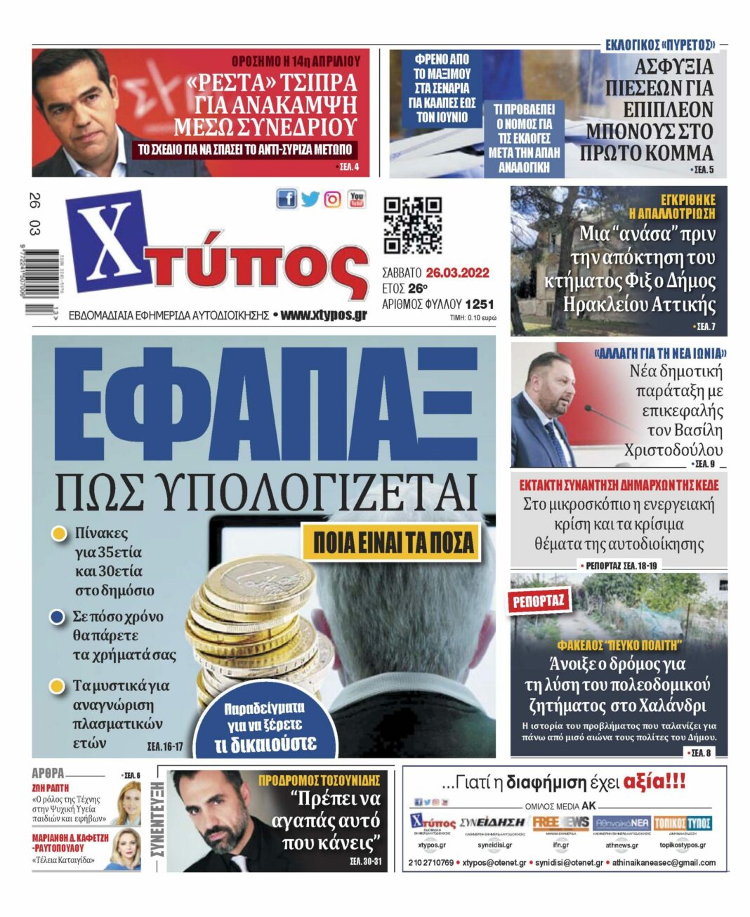 “Πρωτοσέλιδο εφημερίδας «ΧΤΥΠΟΣ» Σάββατο 26 Μαρτίου 2022”