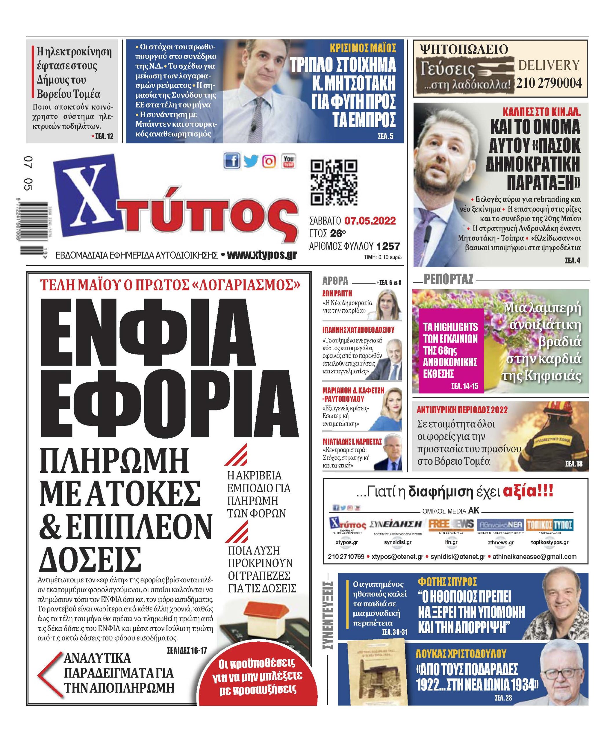 “Πρωτοσέλιδο εφημερίδας «ΧΤΥΠΟΣ» Σάββατο 7 Μαΐου 2022”