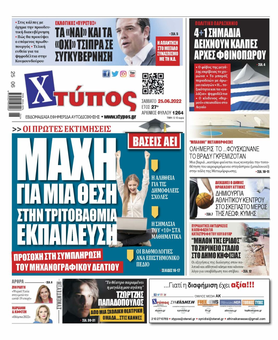 “Πρωτοσέλιδο εφημερίδας «ΧΤΥΠΟΣ» Σάββατο 25 Ιουνίου 2022”