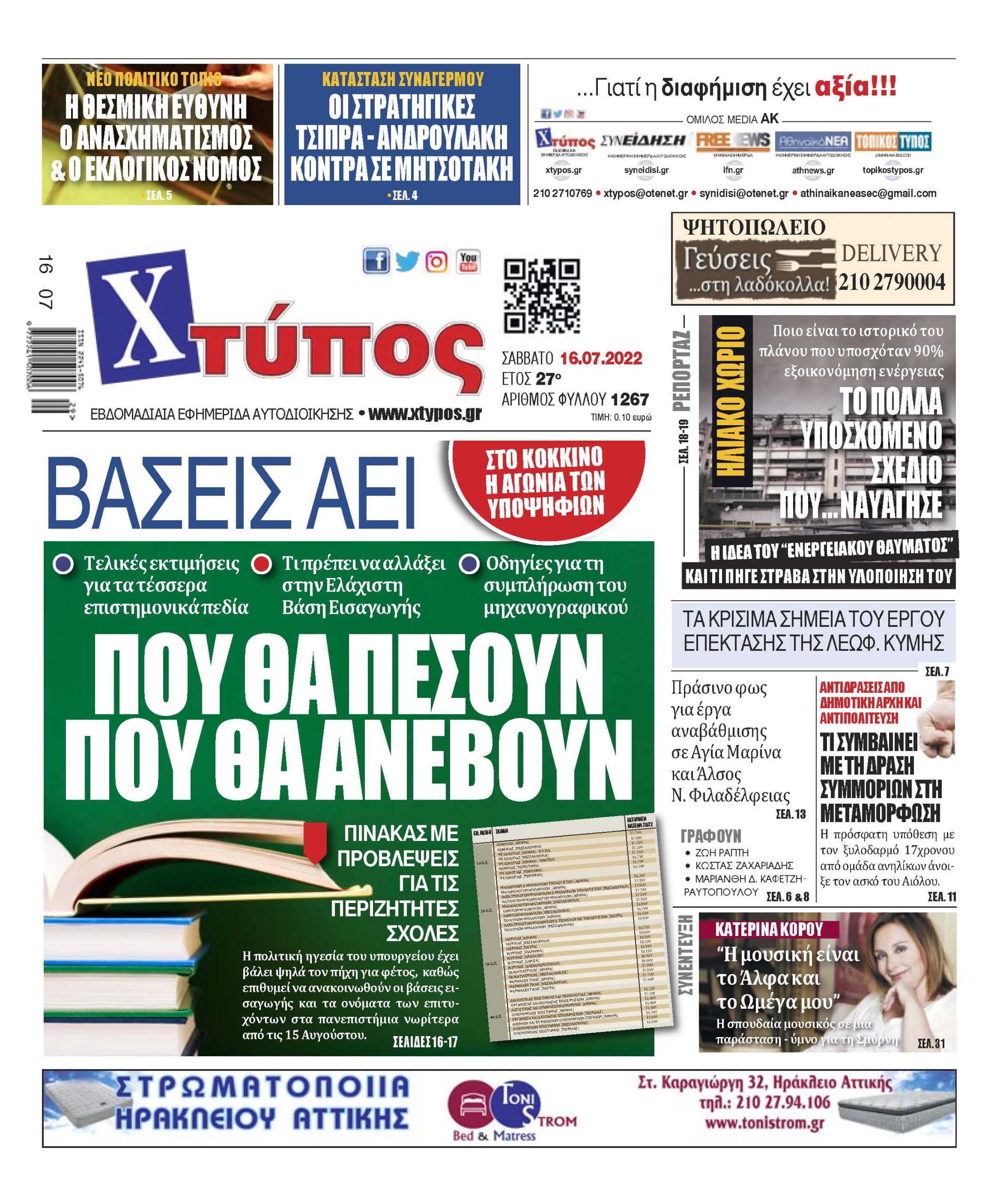 “Πρωτοσέλιδο εφημερίδας «ΧΤΥΠΟΣ» Σάββατο 16 Ιουλίου 2022”
