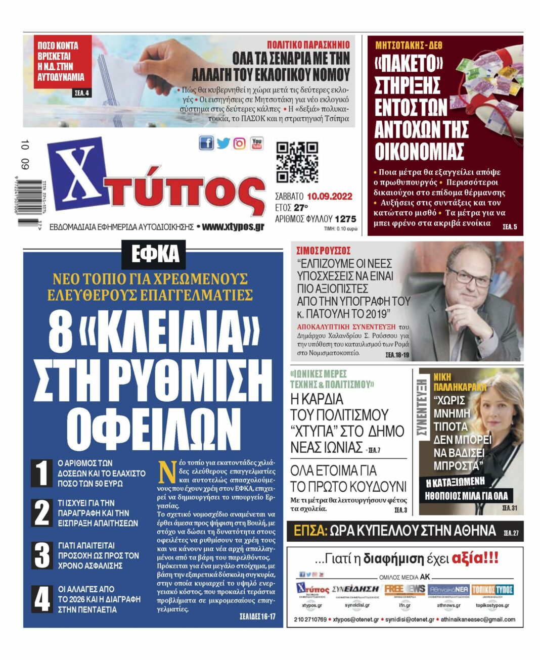 “Πρωτοσέλιδο εφημερίδας «ΧΤΥΠΟΣ» Σάββατο 10 Σεπτεμβρίου 2022”