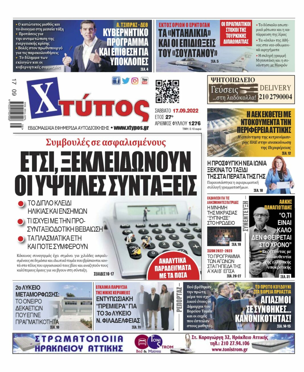 “Πρωτοσέλιδο εφημερίδας «ΧΤΥΠΟΣ» Σάββατο 17 Σεπτεμβρίου 2022”