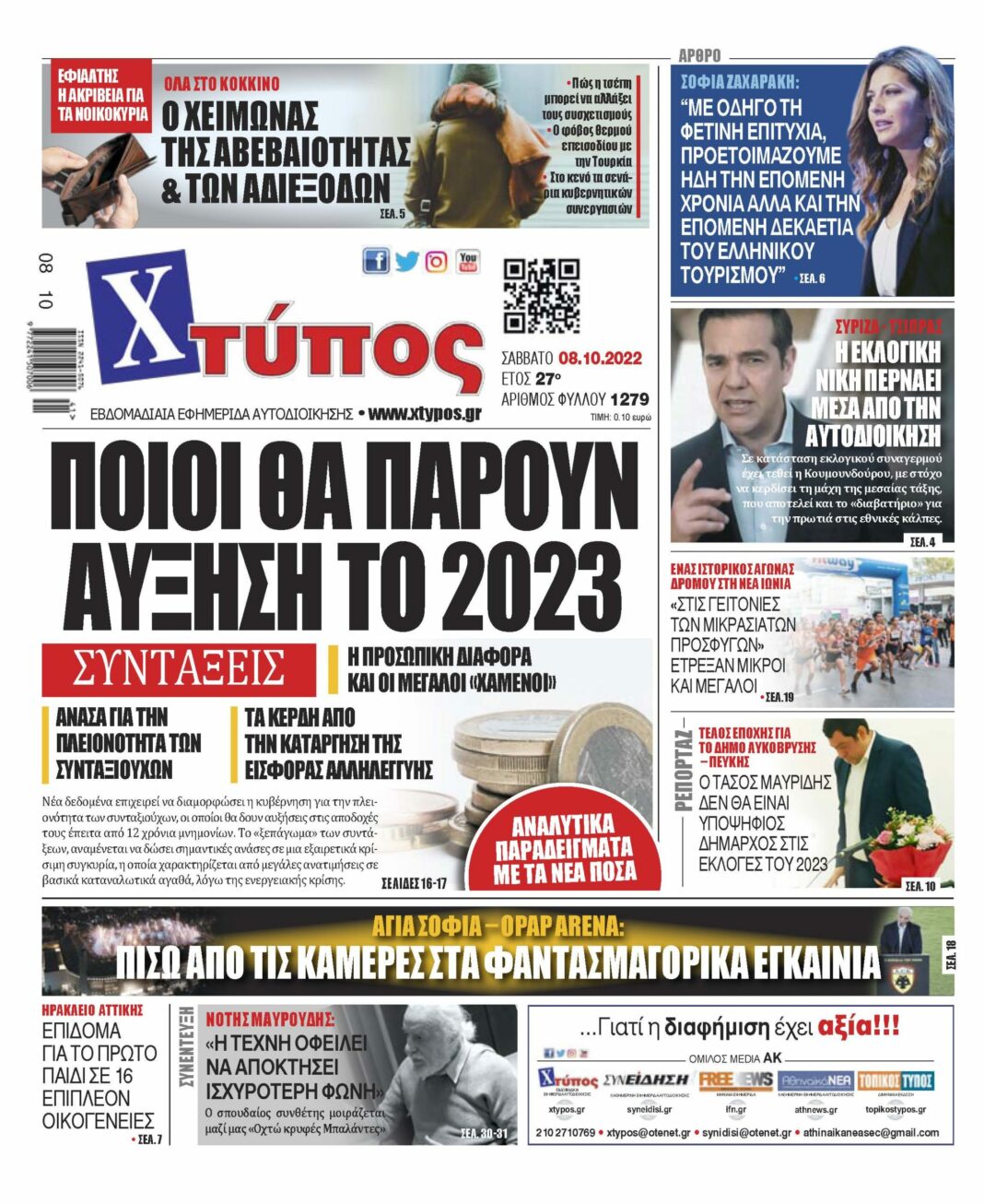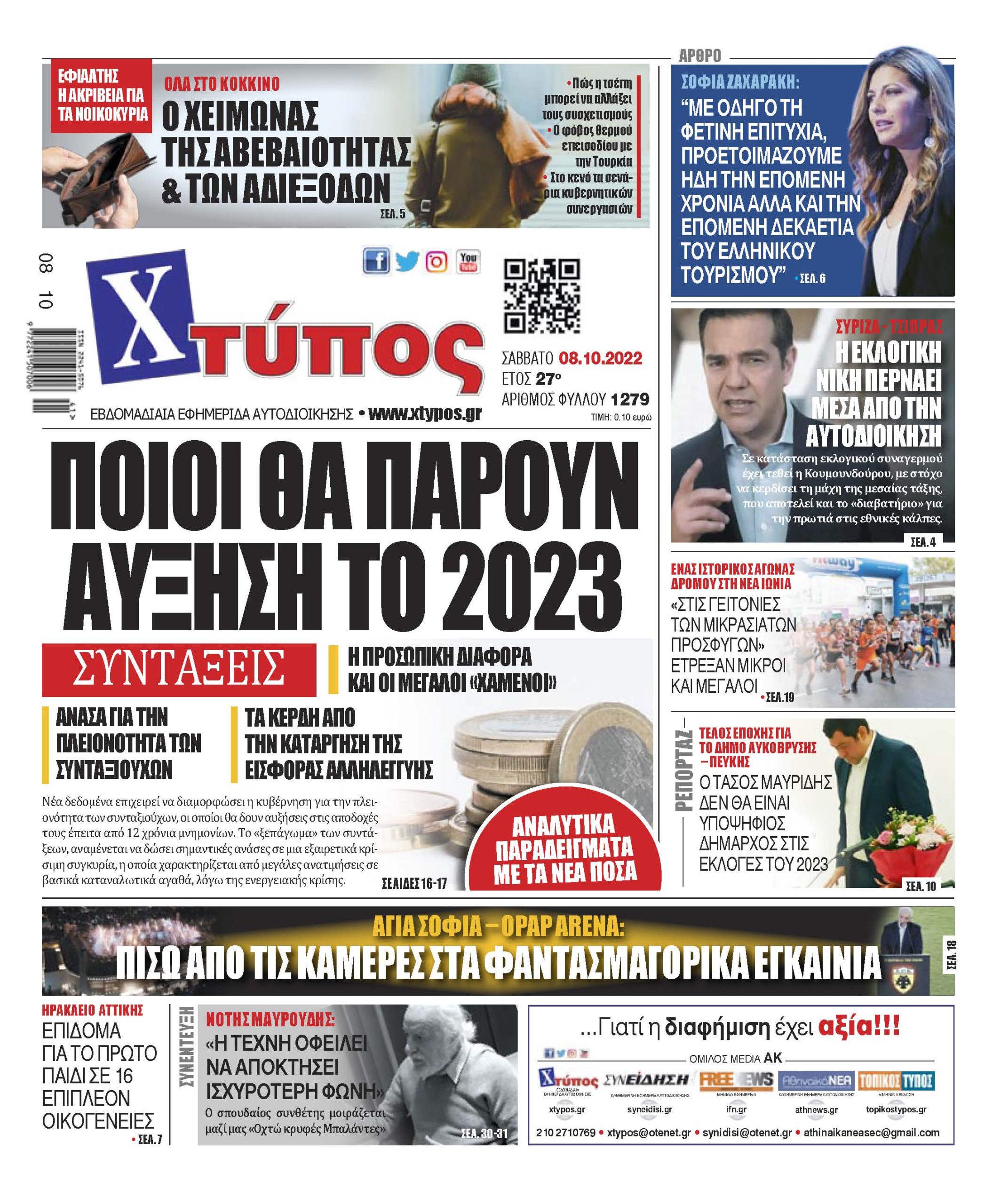 “Πρωτοσέλιδο εφημερίδας «ΧΤΥΠΟΣ» Σάββατο 8 Οκτωβρίου 2022”