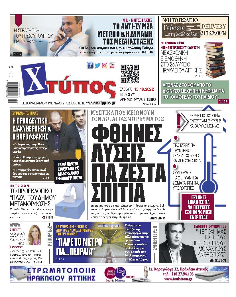 “Πρωτοσέλιδο εφημερίδας «ΧΤΥΠΟΣ» Σάββατο 22 Οκτωβρίου 2022”