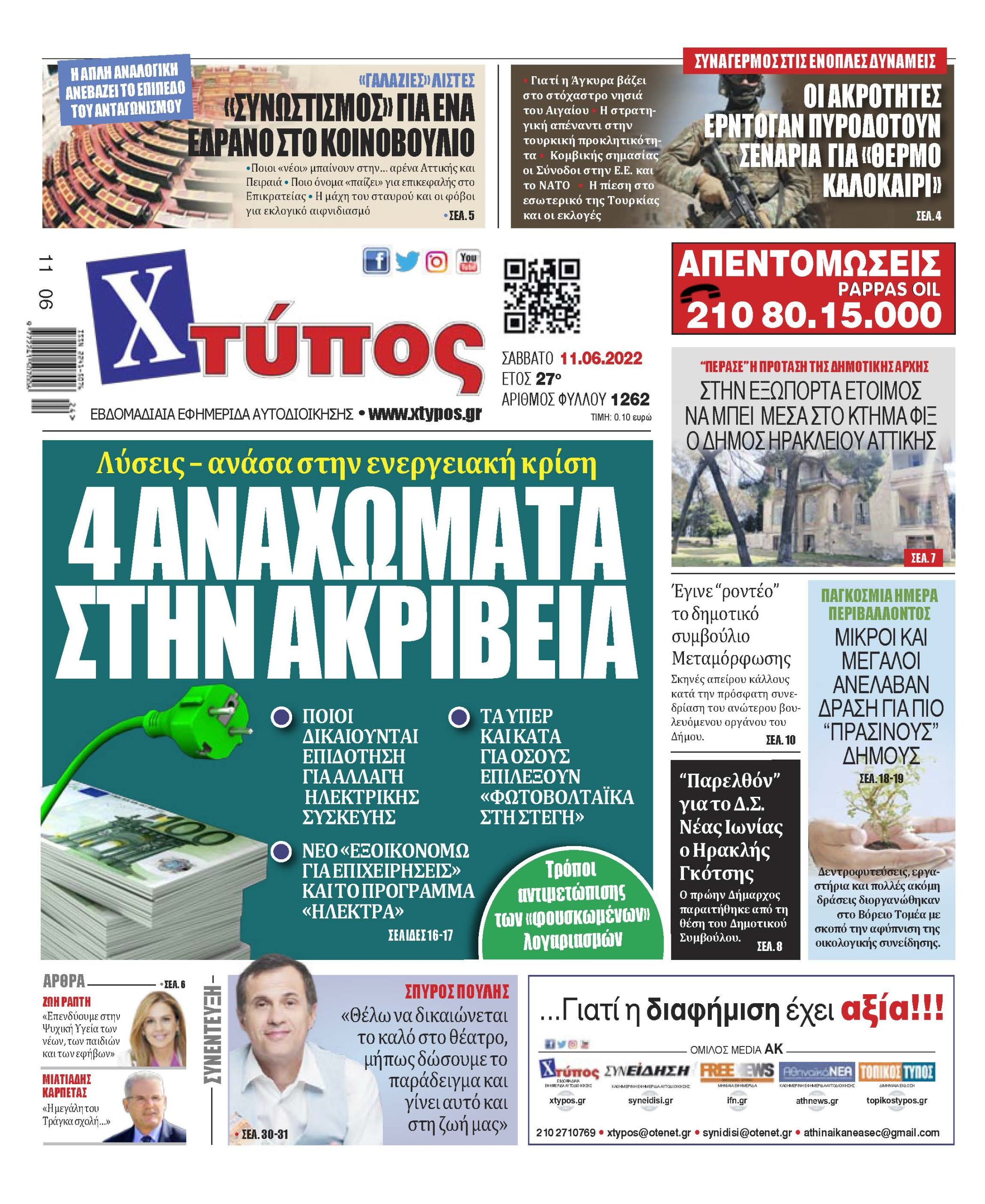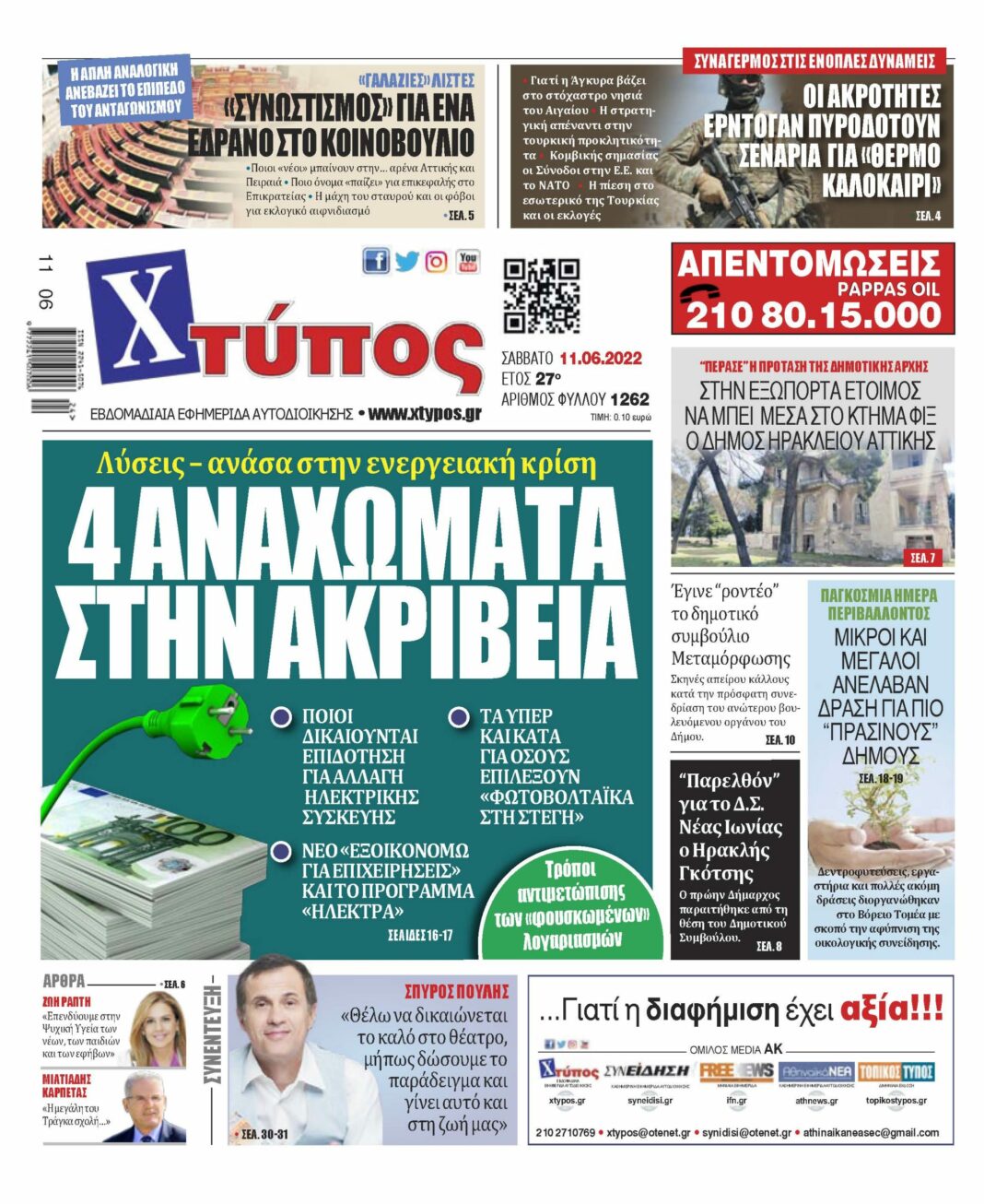 “Πρωτοσέλιδο εφημερίδας «ΧΤΥΠΟΣ» Σάββατο 11 Ιουνίου 2022”