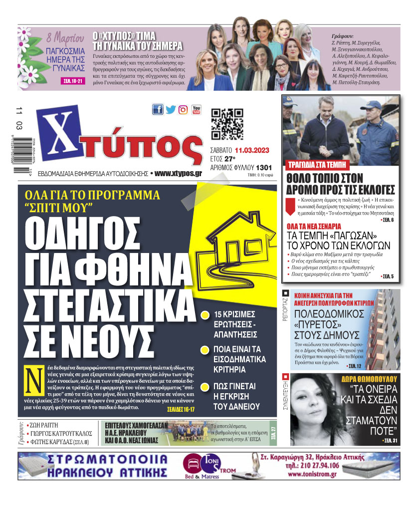 “Πρωτοσέλιδο της εφημερίδας «ΧΤΥΠΟΣ» Σάββατο 11 Μαρτίου 2023”