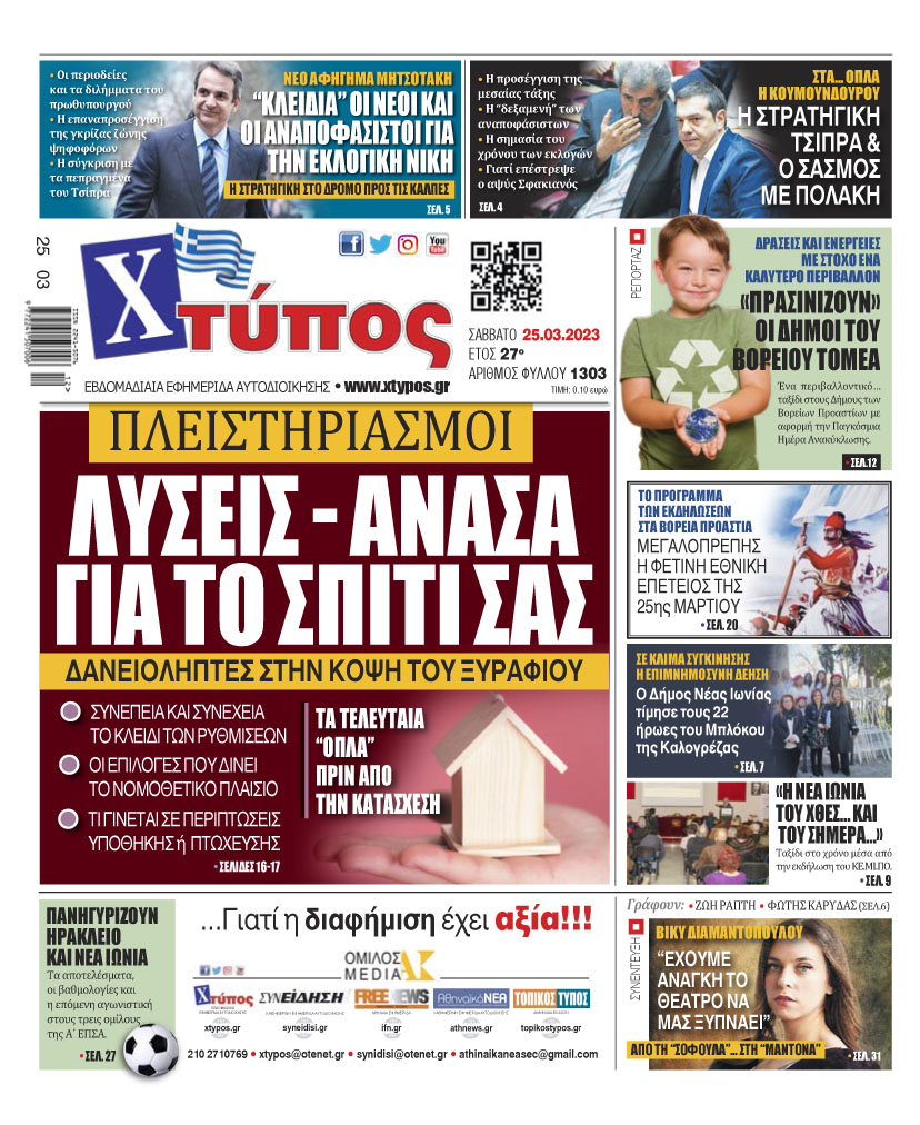 “Πρωτοσέλιδο της εφημερίδας «ΧΤΥΠΟΣ» Σάββατο 25 Μαρτίου 2023”