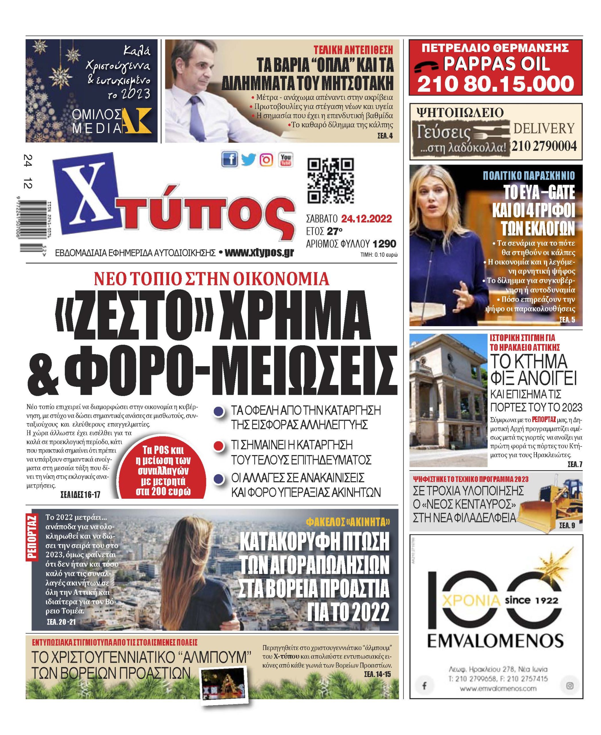“Πρωτοσέλιδο της εφημερίδας «ΧΤΥΠΟΣ» Σάββατο 25 Δεκεμβρίου 2022”