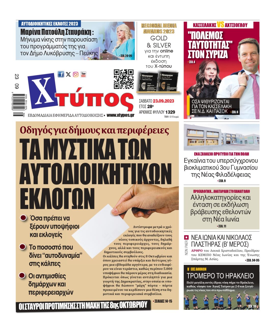 “Πρωτοσέλιδο της εφημερίδας «ΧΤΥΠΟΣ» Σάββατο 23 Σεπτεμβρίου 2023”