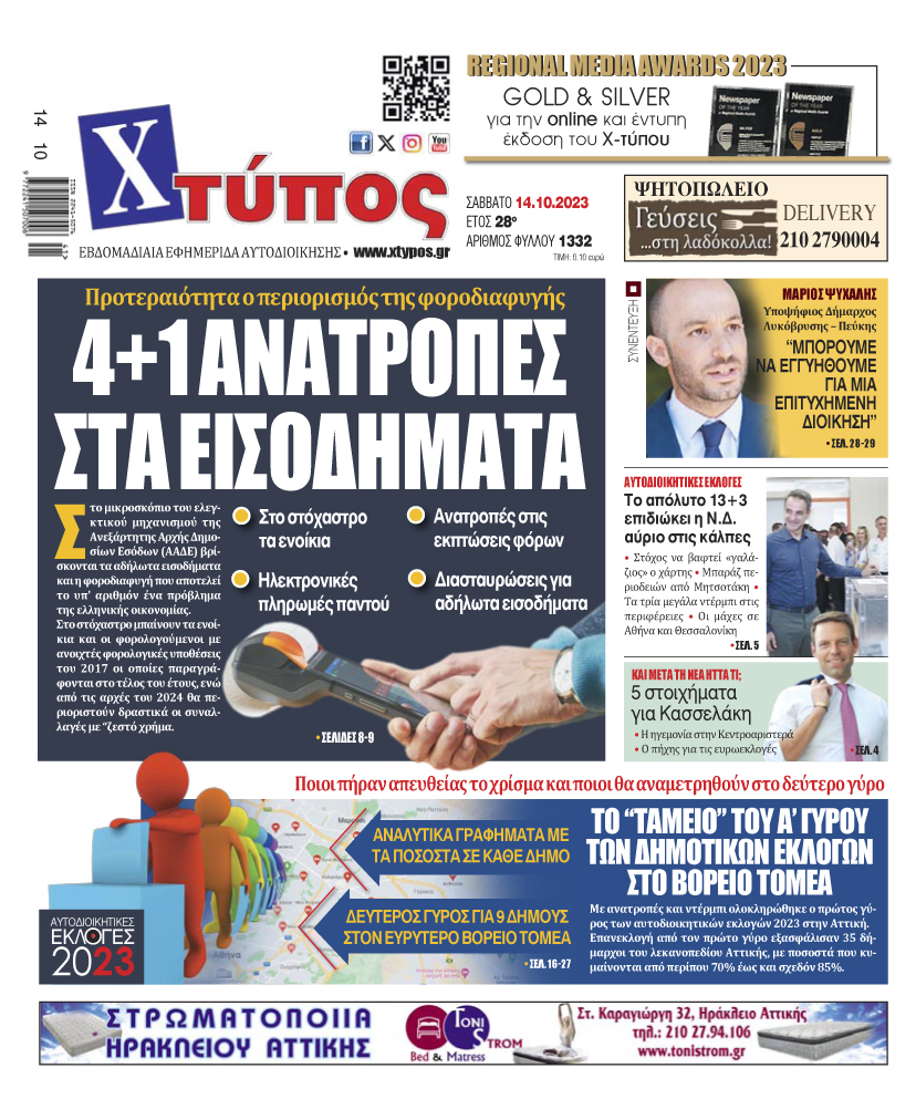 “Πρωτοσέλιδο της εφημερίδας «ΧΤΥΠΟΣ» Σάββατο 15 Οκτωβρίου 2023”