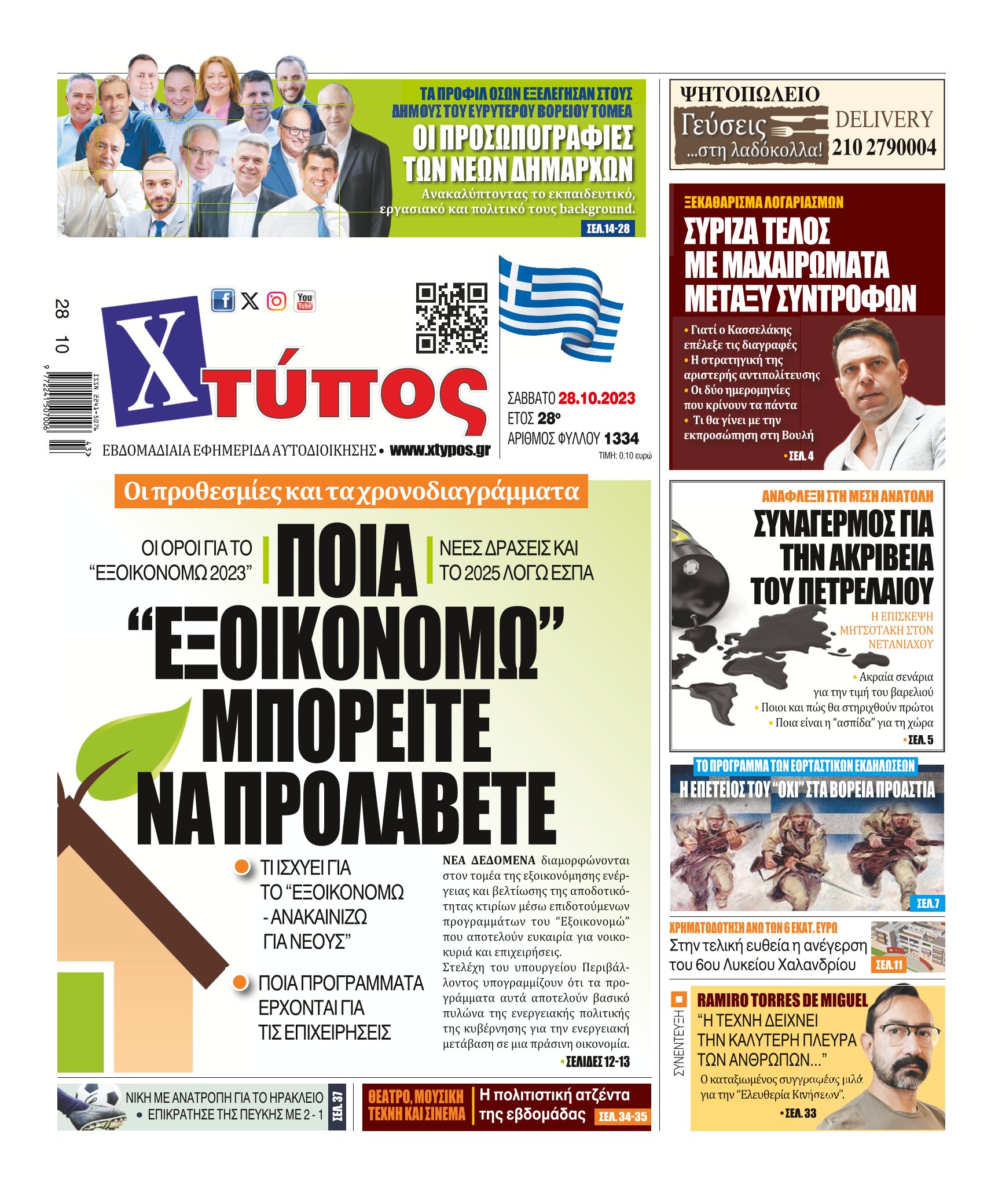 “Πρωτοσέλιδο της εφημερίδας «ΧΤΥΠΟΣ» Σάββατο 28 Οκτωβρίου 2023”