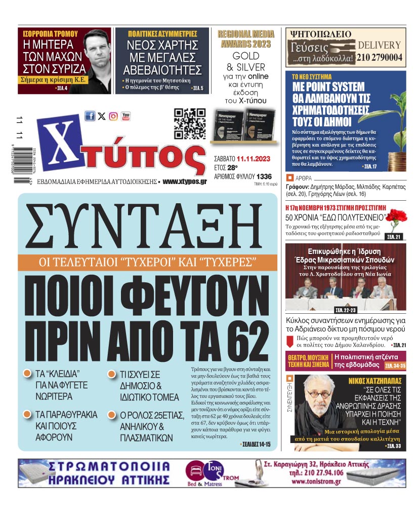 “Πρωτοσέλιδο της εφημερίδας «ΧΤΥΠΟΣ» Σάββατο 11 Νοεμβρίου 2023”