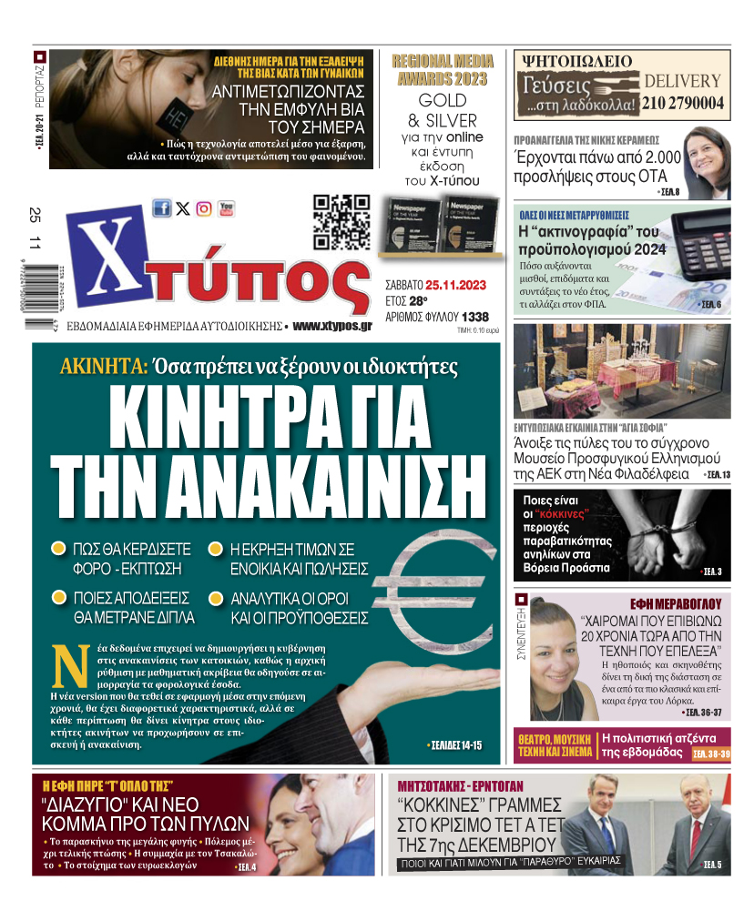 “Πρωτοσέλιδο της εφημερίδας «ΧΤΥΠΟΣ» Σάββατο 25 Νοεμβρίου 2023”
