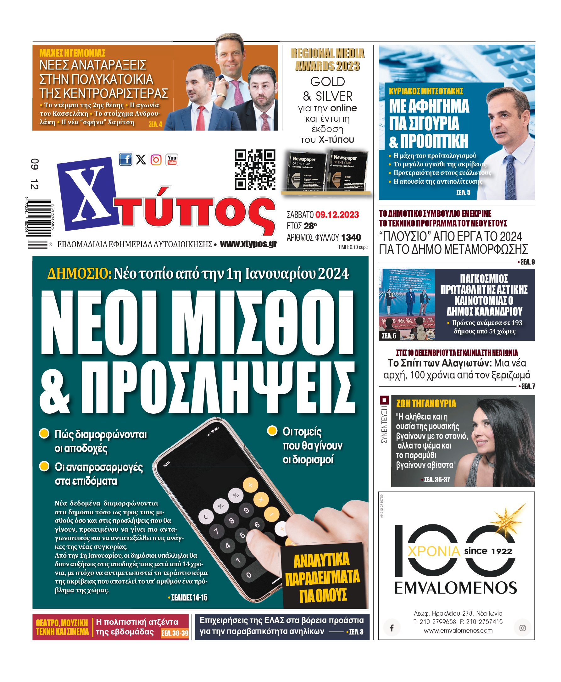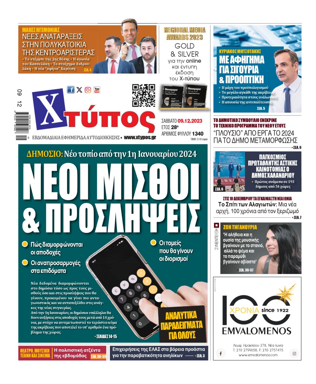 “Πρωτοσέλιδο της εφημερίδας «ΧΤΥΠΟΣ» Σάββατο 9 Δεκεμβρίου 2023”