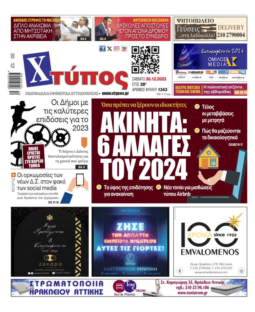 “Πρωτοσέλιδο της εφημερίδας «ΧΤΥΠΟΣ» Σάββατο 30 Δεκεμβρίου 2023”