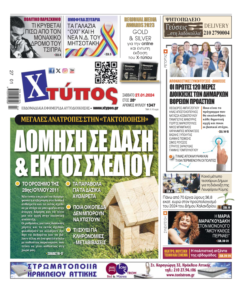 “Πρωτοσέλιδο της εφημερίδας «ΧΤΥΠΟΣ» Σάββατο 27 Ιανουαρίου 2024”