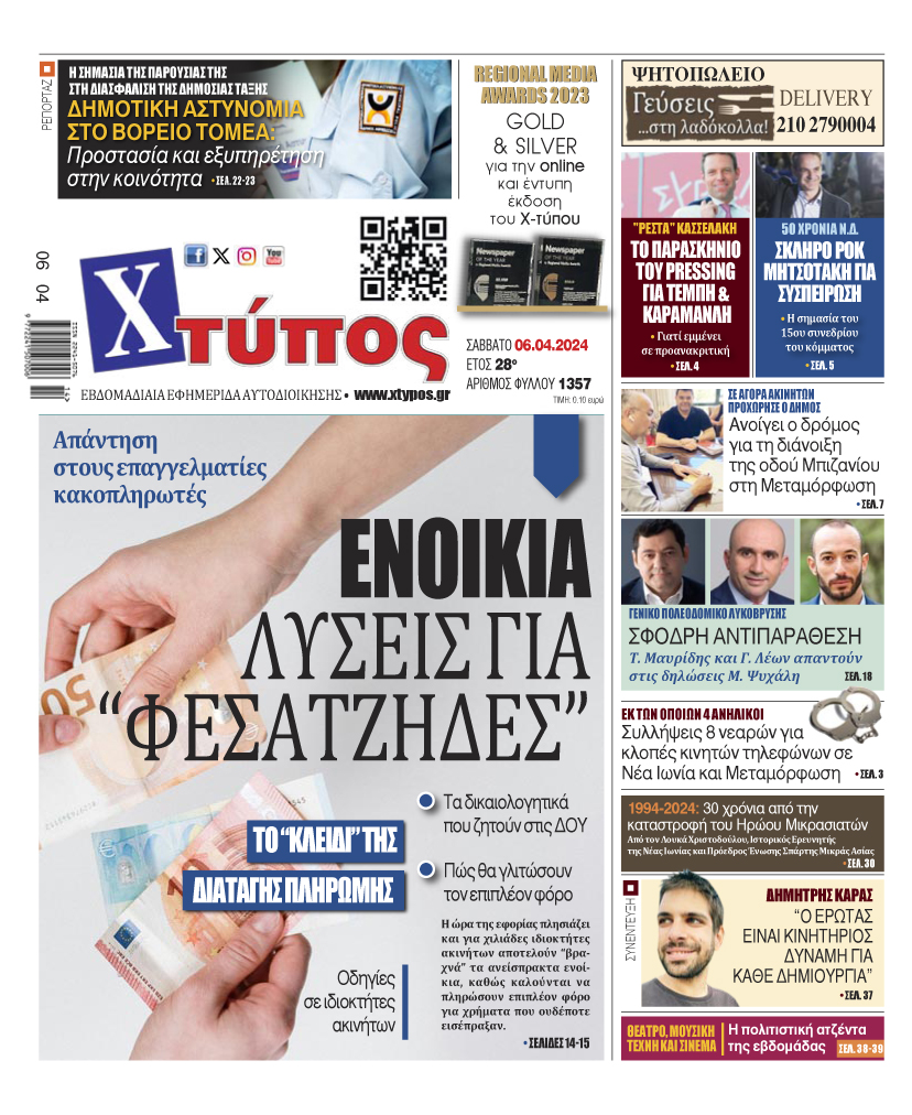 - Κατεβάστε το ηλεκτρονικό φύλλο: Ηλεκτρονική έκδοση εφημερίδας Χτύπος, Φύλλο 1357, 4/5/2024