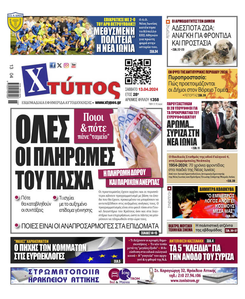“Πρωτοσέλιδο της εφημερίδας «ΧΤΥΠΟΣ» Σάββατο 13 Απριλίου 2024”