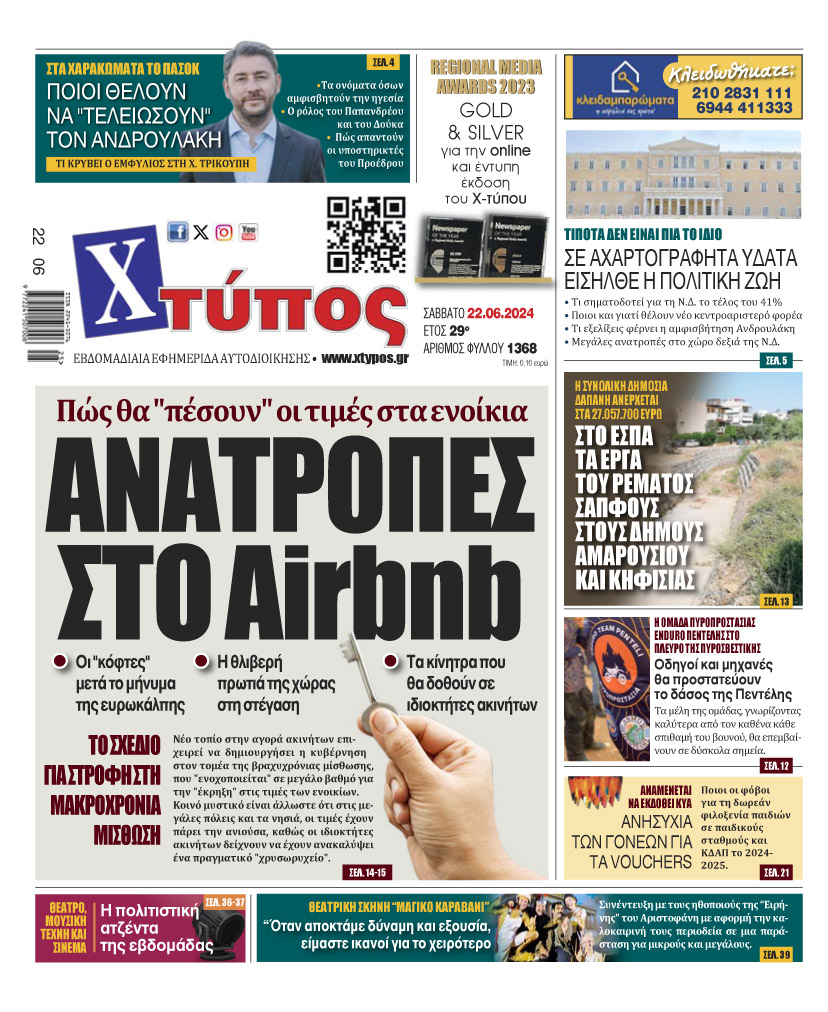 “Πρωτοσέλιδο της εφημερίδας «ΧΤΥΠΟΣ» Σάββατο 22 Ιουνίου 2024”