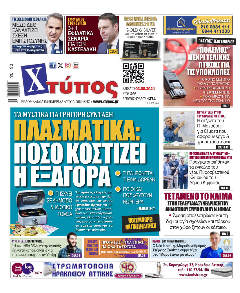 “Πρωτοσέλιδο της εφημερίδας «ΧΤΥΠΟΣ» Σάββατο 3 Αυγούστου 2024”
