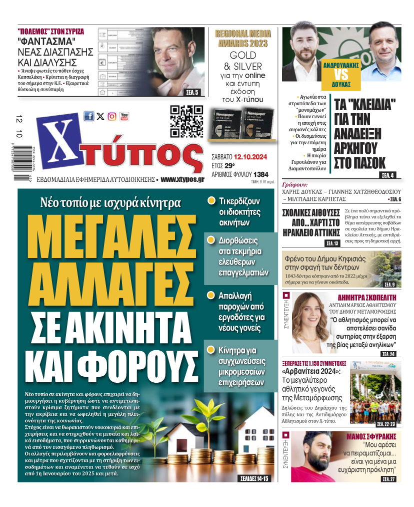 “Πρωτοσέλιδο της εφημερίδας «ΧΤΥΠΟΣ» Σάββατο 12 Οκτωβρίου 2024”