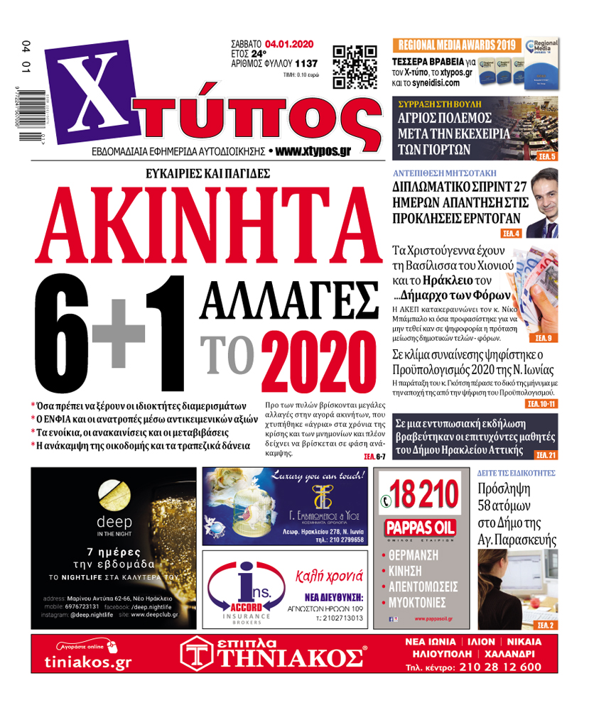 Πρωτοσέλιδο «ΧΤΥΠΟΣ» Σάββατο 04 Ιανουαρίου 2020