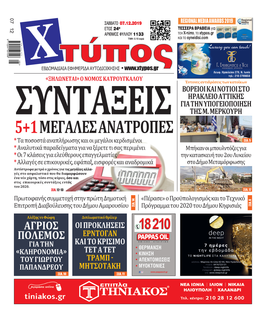 Πρωτοσέλιδο «ΧΤΥΠΟΣ» Σάββατο 07 Δεκεμβρίου 2019
