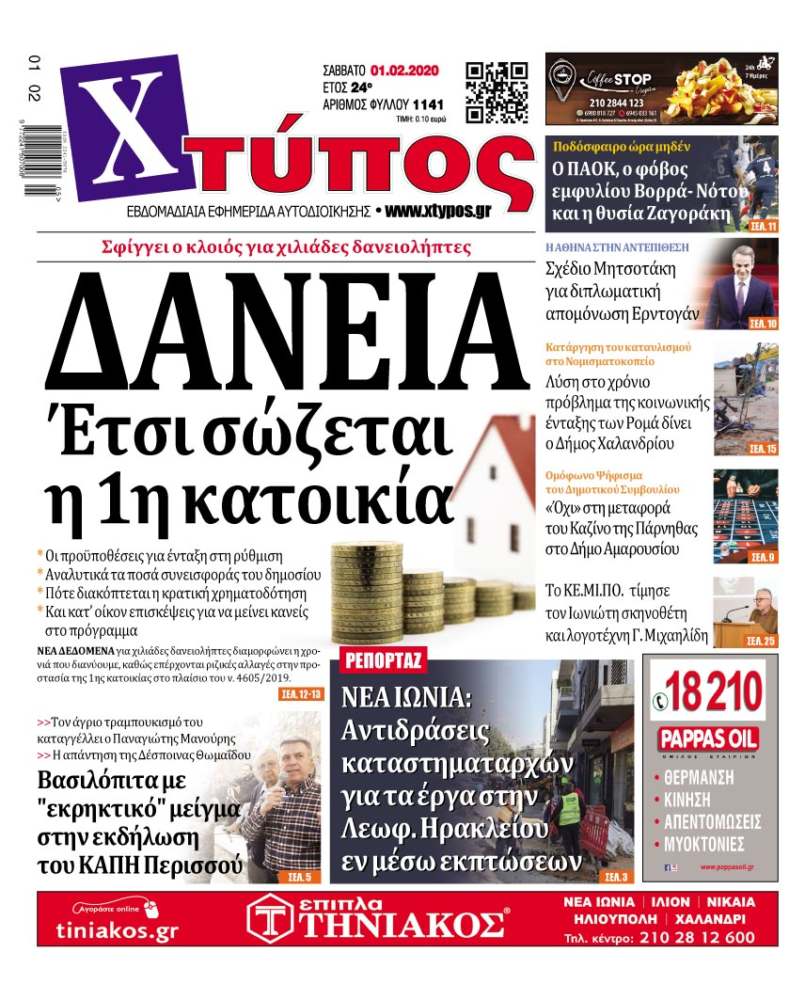 Πρωτοσέλιδο «ΧΤΥΠΟΣ» Σάββατο 1 Φεβρουαρίου 2020