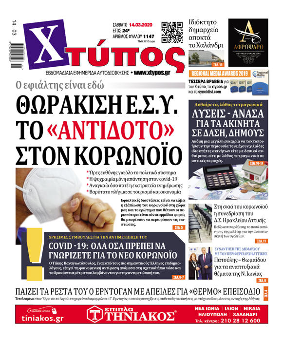 Πρωτοσέλιδο «ΧΤΥΠΟΣ» Σάββατο 14 Μαρτίου 2020
