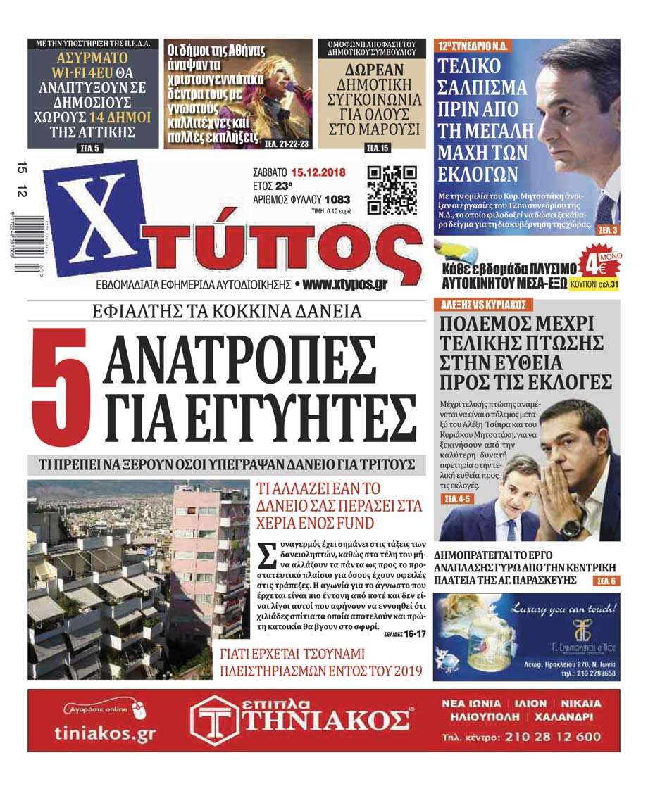 Πρωτοσέλιδο «ΧΤΥΠΟΣ» Σάββατο 15 Δεκεμβρίου 2018