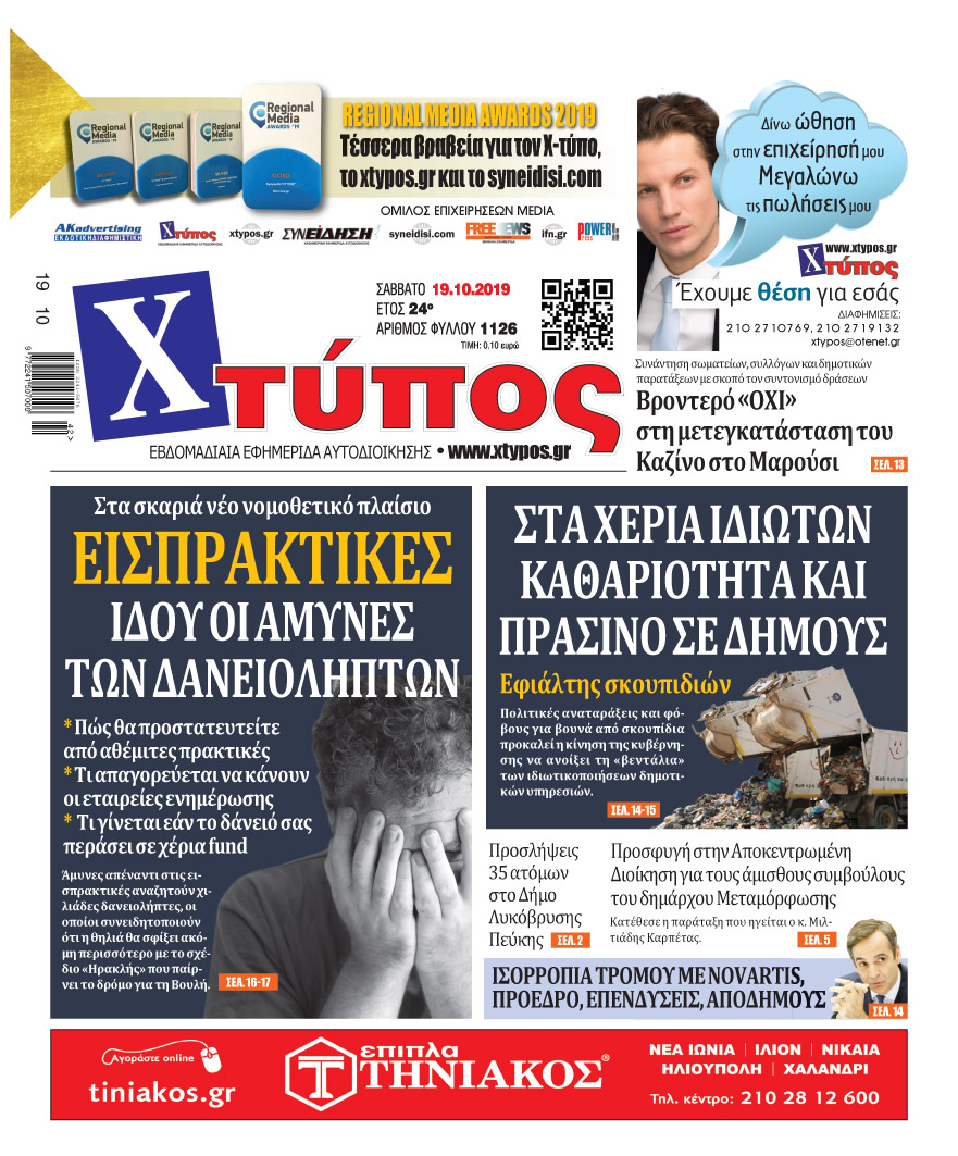 Πρωτοσέλιδο «ΧΤΥΠΟΣ» Σάββατο 19 Οκτωβρίου 2019
