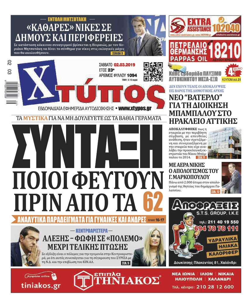 Πρωτοσέλιδο «ΧΤΥΠΟΣ» Σάββατο 2 Μαρτίου 2019