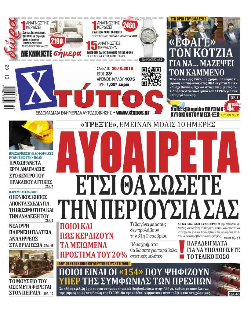 Πρωτοσέλιδο «ΧΤΥΠΟΣ» Σάββατο 20 Οκτωβρίου 2018
