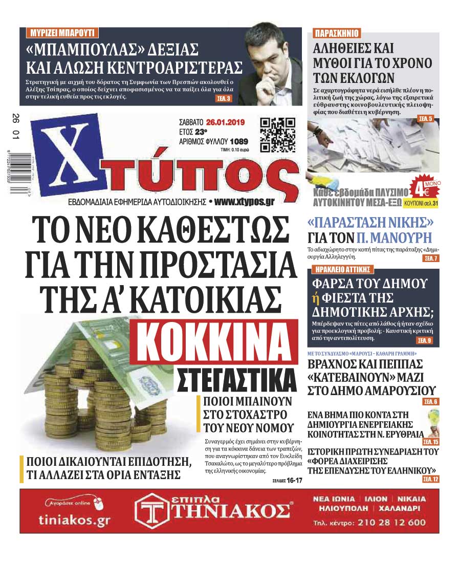 Πρωτοσέλιδο «ΧΤΥΠΟΣ» Σάββατο 26 Ιανουαρίου 2019