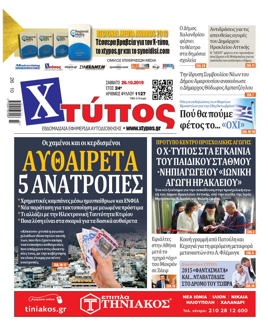 Πρωτοσέλιδο «ΧΤΥΠΟΣ» Σάββατο 26 Οκτωβρίου 2019