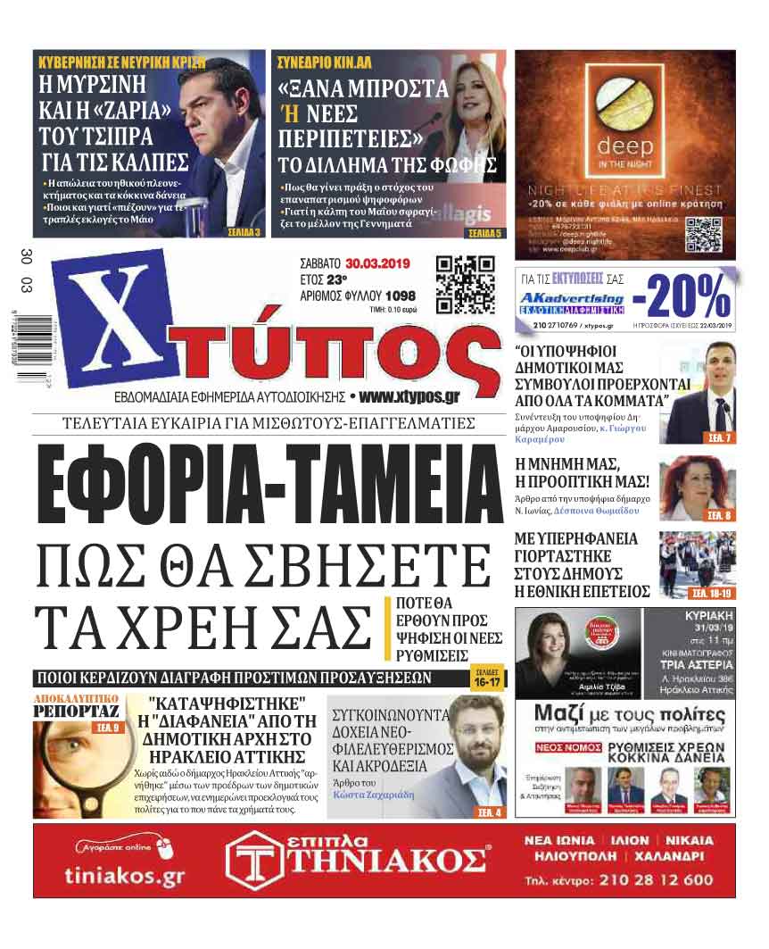 Πρωτοσέλιδο «ΧΤΥΠΟΣ» Σάββατο 30 Μαρτίου 2019
