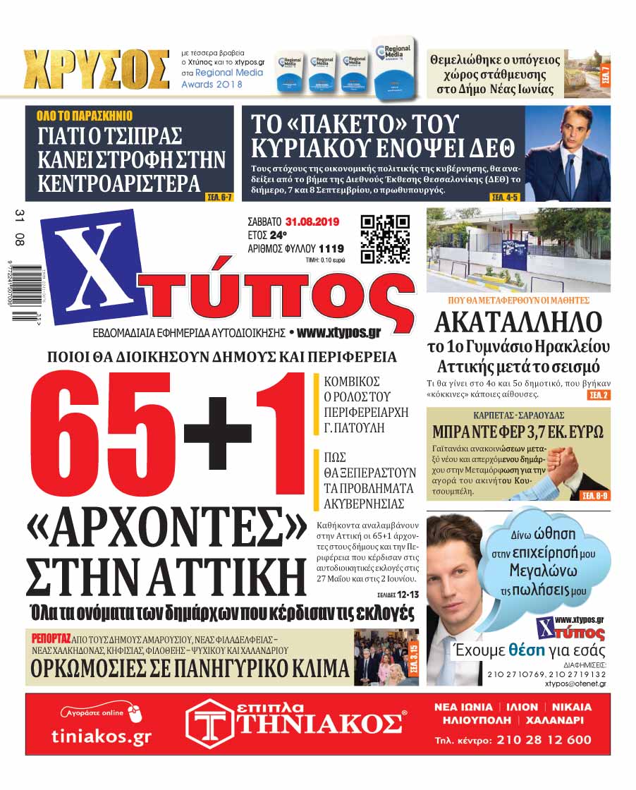 Πρωτοσέλιδο «ΧΤΥΠΟΣ» Σάββατο 31 Αυγούστου 2019