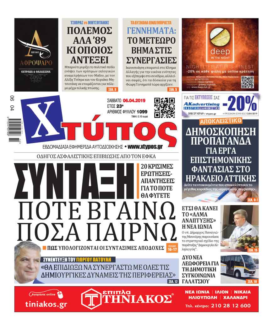 Πρωτοσέλιδο «ΧΤΥΠΟΣ» Σάββατο 6 Απριλίου 2019