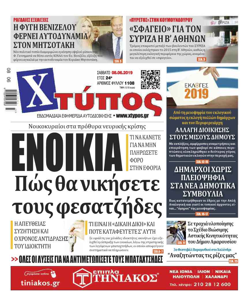 Πρωτοσέλιδο «ΧΤΥΠΟΣ» Σάββατο 8 Ιουνίου 2019