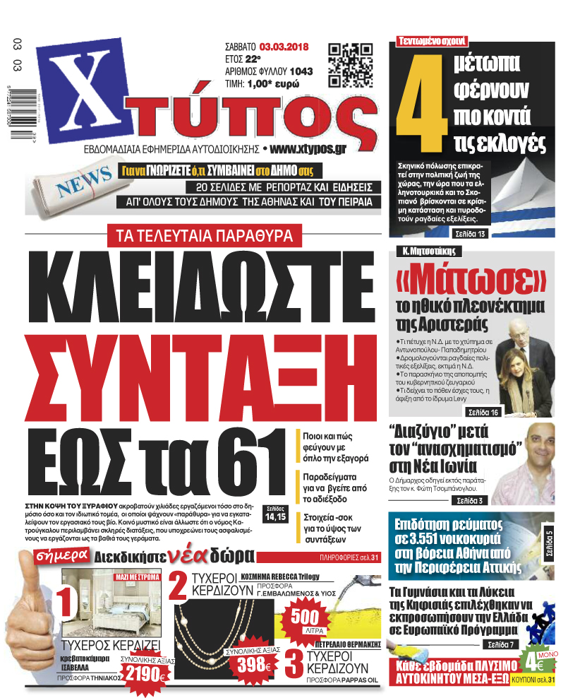 Πρωτοσέλιδο «ΧΤΥΠΟΣ» Σαββάτου 03 Μαρτίου 2018