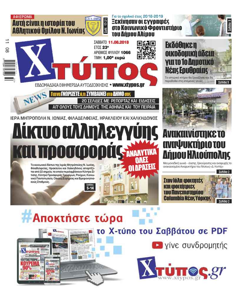 Πρωτοσέλιδο «ΧΤΥΠΟΣ» Σαββάτου 11 Αυγούστου 2018